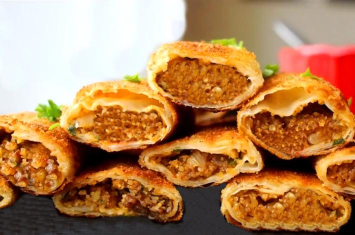 Bu şekilde tüm yufkalarımızı yumuşattıktan sonra kıymalı harcımızdan 1 yemek kaşığı olacak şekilde yufkamızın ortasına koyarak biraz yayalım. Yufkamızı rulo olacak şekilde sararken uç kısımlarını içe doğru parçalamadan koyup güzelce sarmamız gerekiyor. Bütün yufkalarımızı bu şekilde yaptıktan sonra kızartma aşamasına geçelim. Tavamıza sıvıyağımızı koyup yüksek ateşte kızarmasını sağlayalım. Bu şekilde yufkalarımız kızarırken fazla yağ çekmesini engellemeye çalışacağız.