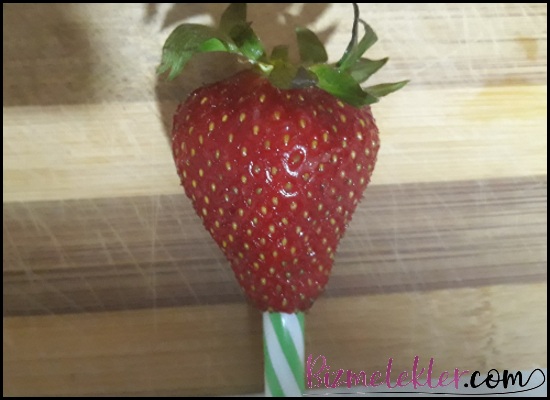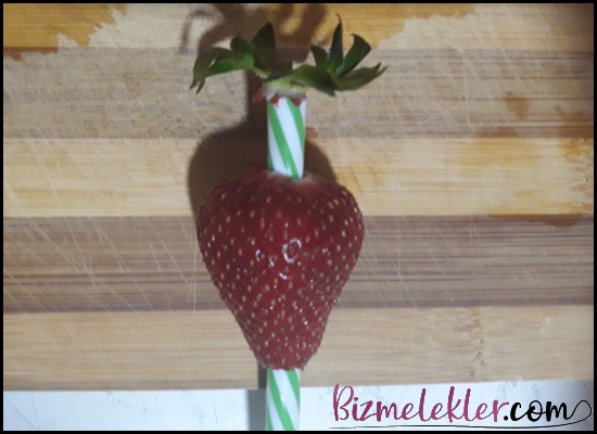 Resim 2’de yer alan şekilde pipetimizi çileğin uç tarafına dikkatlice yerleştirelim. İlk denemede yapamamanız çok normal. Birkaç defa denedikten sonra bu işlemi çok rahat bir şekilde yapabilirsiniz. Önemli olan çileğin iç tarafında yer alan damar kanalına denk getirmek. Gerisi çorap söküğü gibi gelecektir.