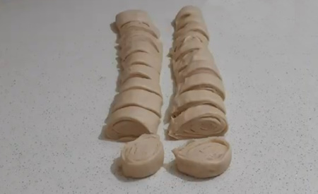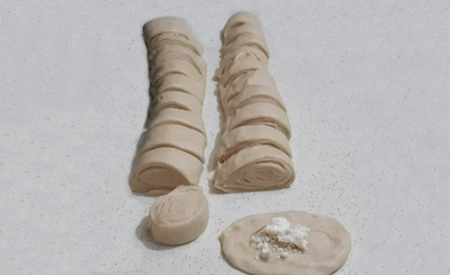 Dilimlemiş olduğumuz hamurlarımızın formunu çok fazla bozmadan elimizle bastırarak biraz açalım. Ortasına hazırlamış olduğumuz peynir harcından koyduktan sonra kenarlarından katlayarak midye şeklini verelim.