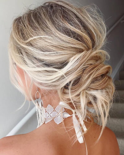 Düğün için saç modeli seçiminde toplu bir görüntü oluşturmak isteyen sarı saçlı kadınlar için en iyi tercih kesinlikle dağınık topuz modeli olacaktır. Özellikle kakül ile işlendiğinde mükemmel bir görünüm sağlayabilirsiniz. Dağınık topuz modeli düz veya kıvırcık saç fark etmeksizin hoş bir görünüm yakalamanıza yardımcı olacaktır. Özellikle kıvırcık saçlı kadınlarda bukleleri belirginleştirip uygulandığında salaş ve sade bir görünüm beraber yakalanarak bir şıklık oluşturacaktır.